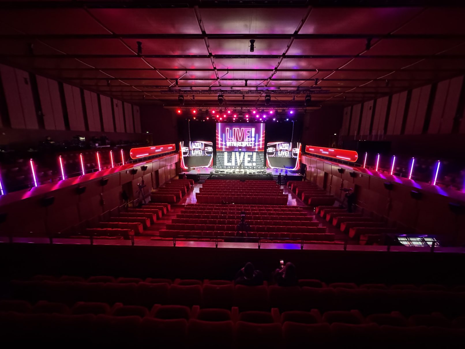Design e Tecnologia Immersiva: Per l’edizione 2025, l’idea centrale della scenografia è stata quella di superare la bidimensionalità per creare un’esperienza totalmente immersiva. Il cuore dell’allestimento è costituito da maxischermi a LED ad alta risoluzione che non si limitano al palco, ma si prolungano strategicamente sulle balconate laterali e superiori della sala, avvolgendo letteralmente la platea e amplificando il senso di partecipazione.