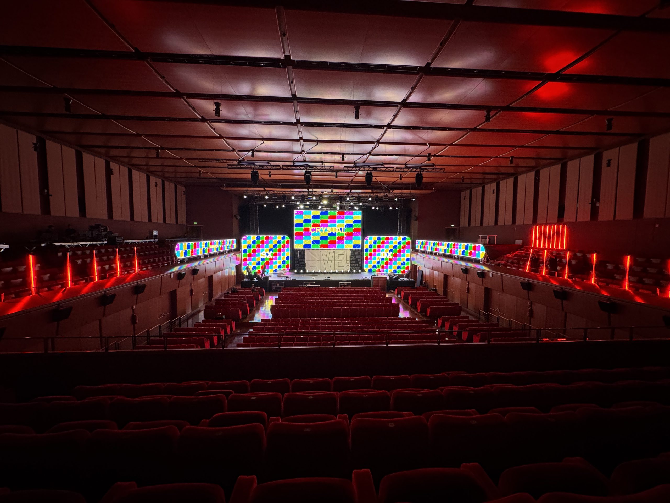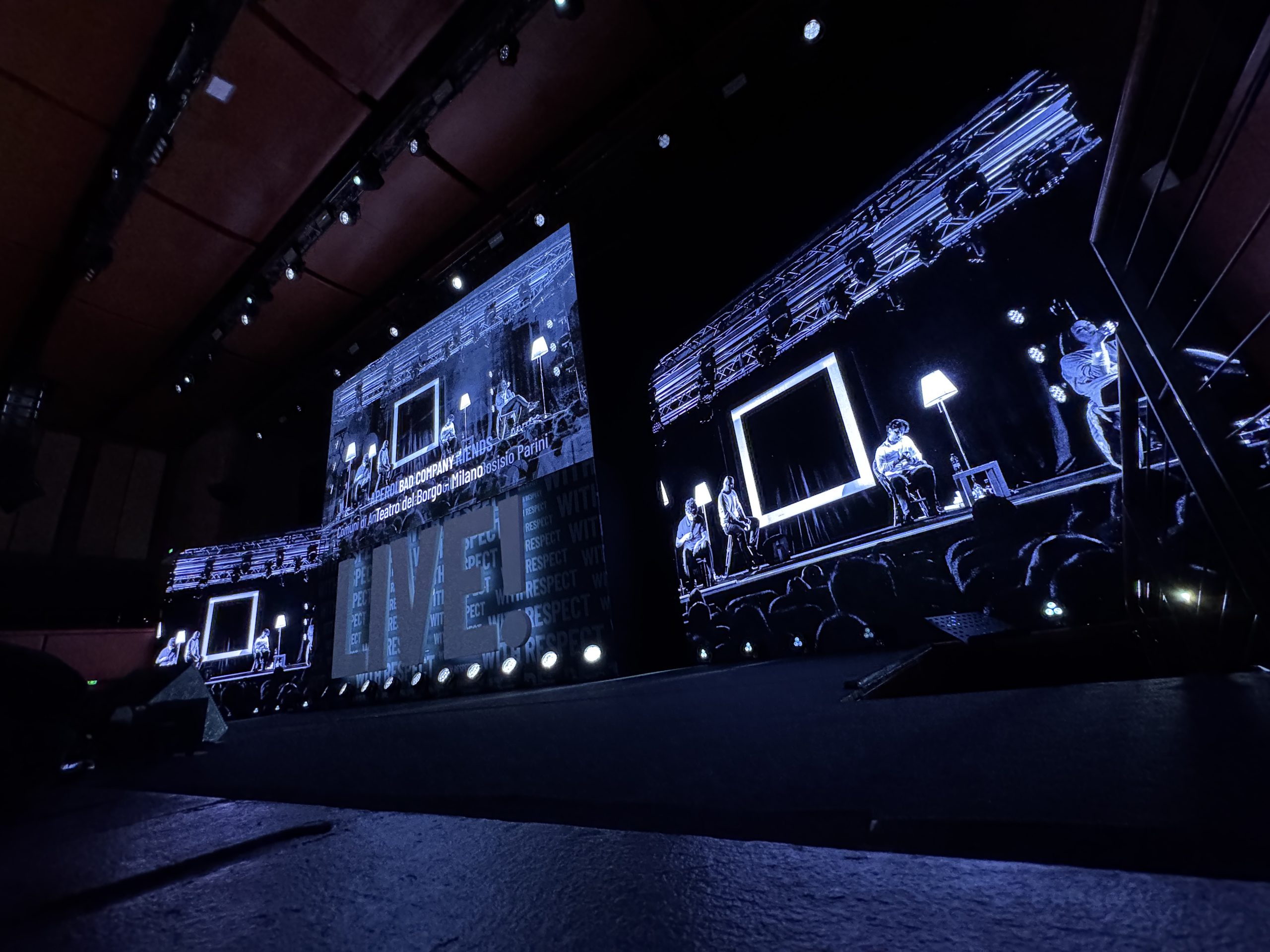 Design e Tecnologia Immersiva: Per l’edizione 2025, l’idea centrale della scenografia è stata quella di superare la bidimensionalità per creare un’esperienza totalmente immersiva. Il cuore dell’allestimento è costituito da maxischermi a LED ad alta risoluzione che non si limitano al palco, ma si prolungano strategicamente sulle balconate laterali e superiori della sala, avvolgendo letteralmente la platea e amplificando il senso di partecipazione.