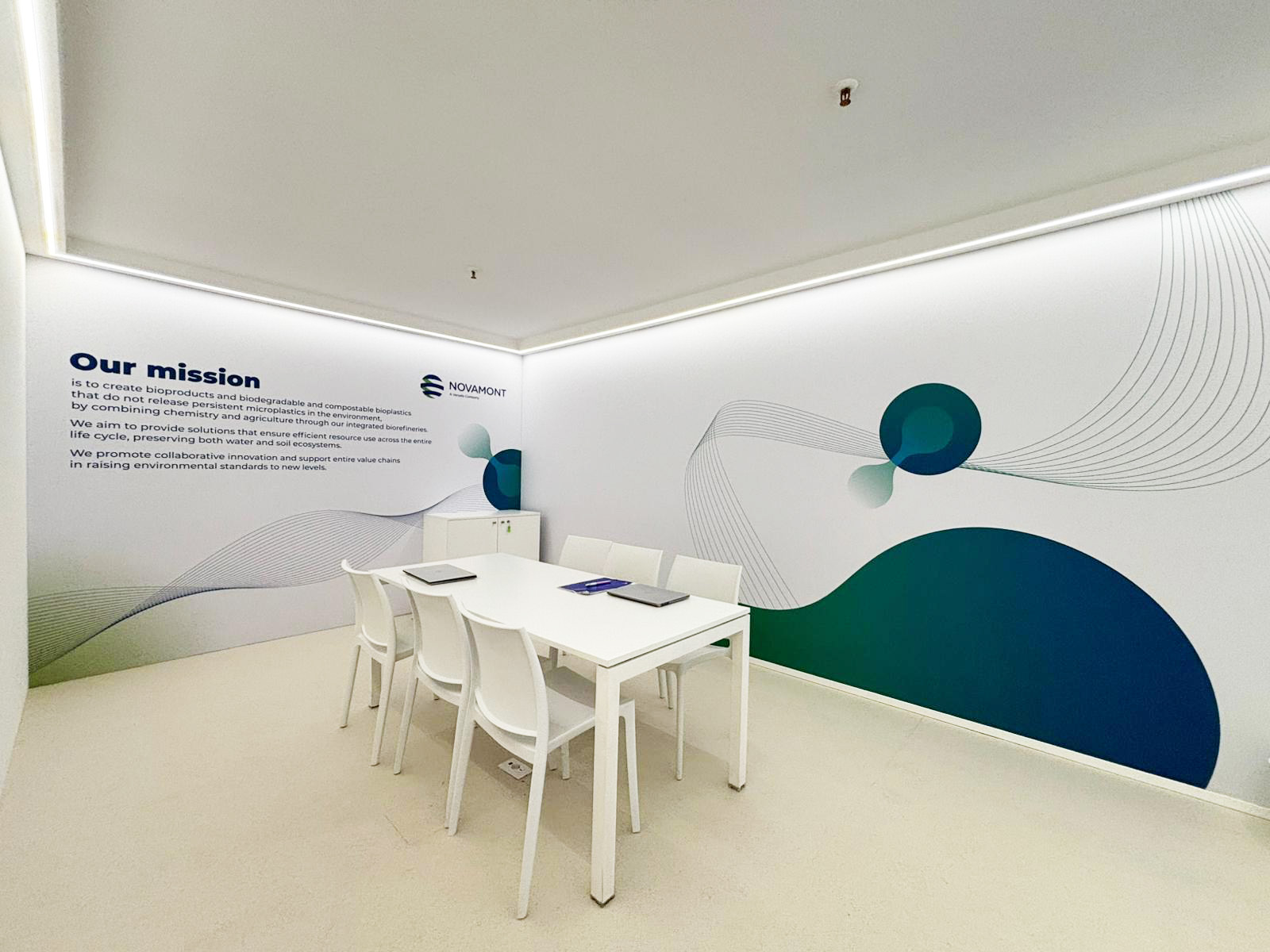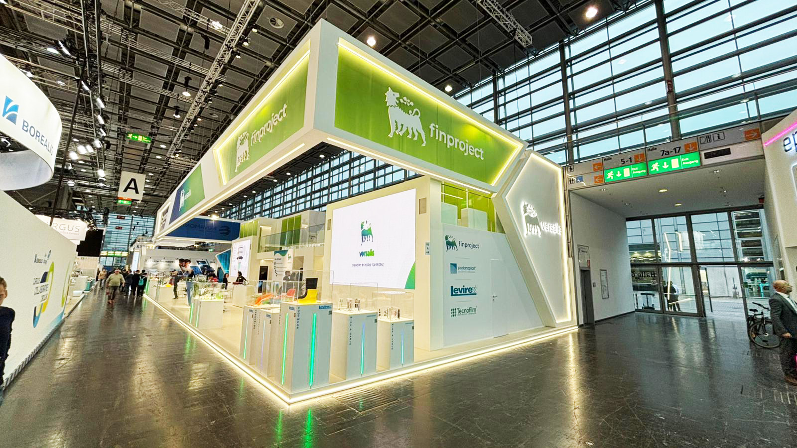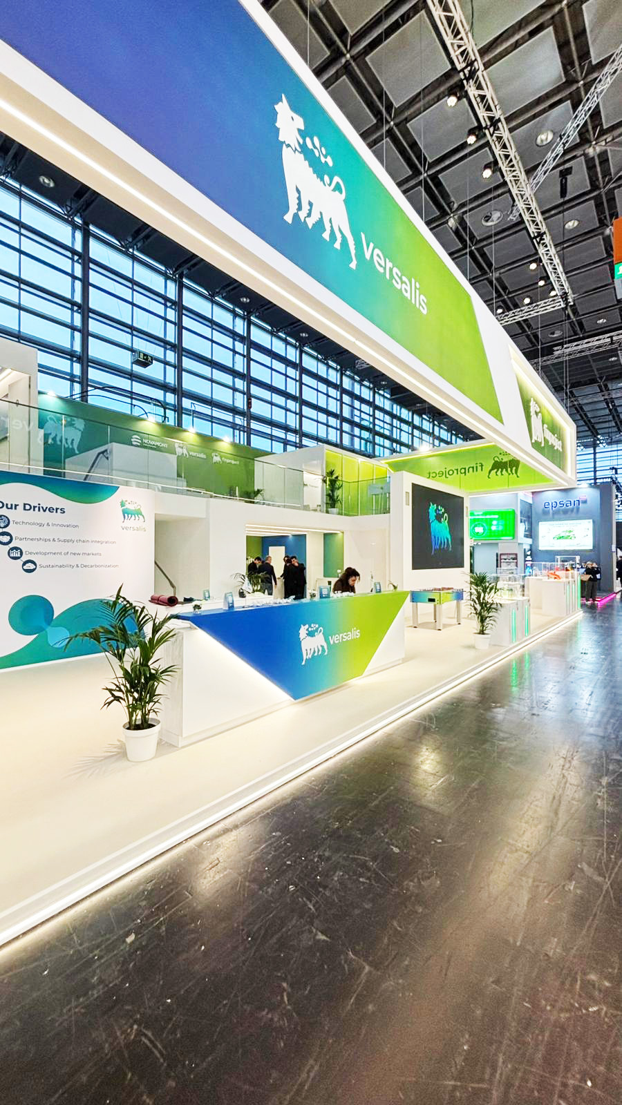 Lo stand è progettato come un ambiente architettonico luminoso e contemporaneo, pensato per rappresentare in modo unitario le diverse identità del gruppo Versalis. L’impostazione modulare e multilivello valorizza la struttura aperta, creando percorsi fluidi tra area espositiva, spazi di relazione e zone istituzionali. Il grande fascione perimetrale sospeso, caratterizzato da campiture di colore in policarbonato e grafiche corporate luminose bifacciali, definisce una presenza riconoscibile e di forte impatto visivo sull’intero padiglione. L’utilizzo di superfici chiare e linee pulite aumenta la luminosità e trasmette un’immagine di innovazione, sostenibilità e trasparenza. Nell’area espositiva, teche illuminate e contenuti interattivi permettono di raccontare prodotti, materiali e tecnologie in modo chiaro e accessibile. I grandi LED wall integrati completano la narrazione visiva con contenuti dinamici. Gli spazi meeting e la lounge, distribuiti tra piano terra e piano superiore, offrono ambienti riservati e confortevoli, con grafiche istituzionali che rafforzano messaggi e valori del brand. Uno stand che combina design, funzionalità e identità, valorizzando il posizionamento del gruppo e offrendo ai visitatori un’esperienza ordinata, immersiva e professionale.