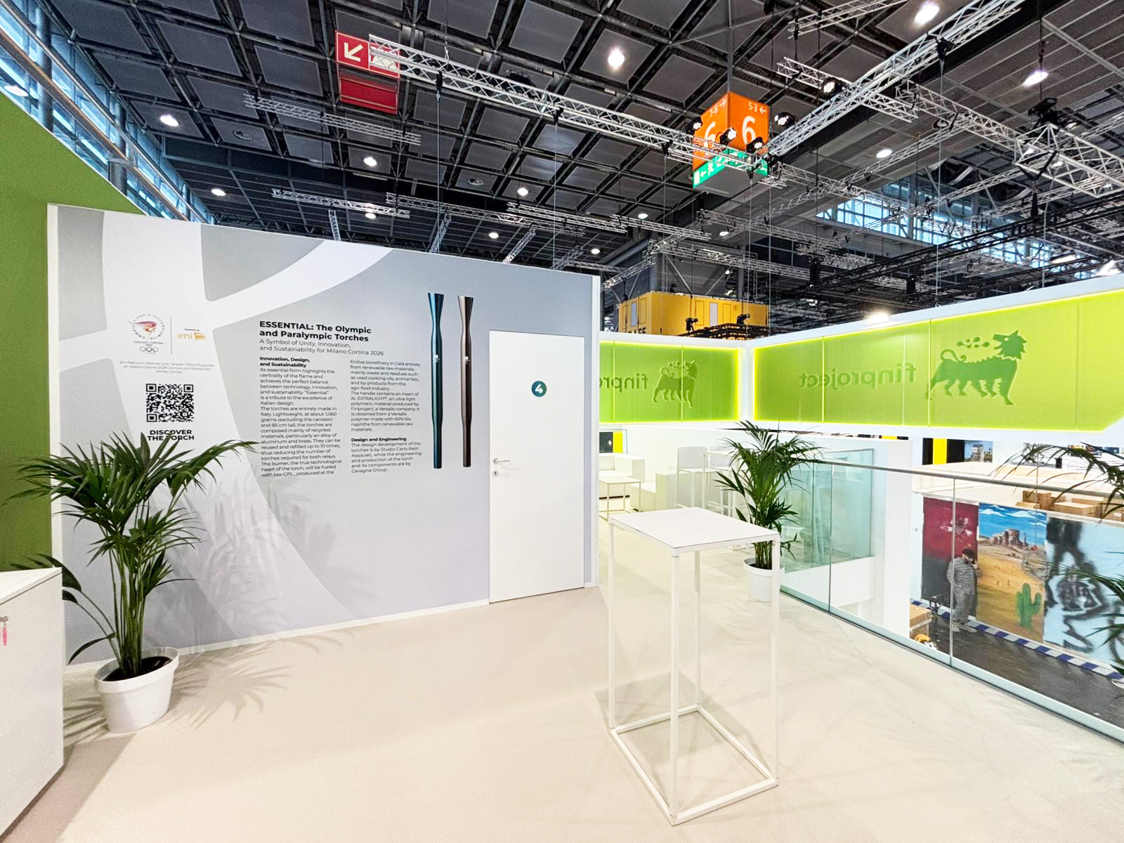 Lo stand è progettato come un ambiente architettonico luminoso e contemporaneo, pensato per rappresentare in modo unitario le diverse identità del gruppo Versalis. L’impostazione modulare e multilivello valorizza la struttura aperta, creando percorsi fluidi tra area espositiva, spazi di relazione e zone istituzionali. Il grande fascione perimetrale sospeso, caratterizzato da campiture di colore in policarbonato e grafiche corporate luminose bifacciali, definisce una presenza riconoscibile e di forte impatto visivo sull’intero padiglione. L’utilizzo di superfici chiare e linee pulite aumenta la luminosità e trasmette un’immagine di innovazione, sostenibilità e trasparenza. Nell’area espositiva, teche illuminate e contenuti interattivi permettono di raccontare prodotti, materiali e tecnologie in modo chiaro e accessibile. I grandi LED wall integrati completano la narrazione visiva con contenuti dinamici. Gli spazi meeting e la lounge, distribuiti tra piano terra e piano superiore, offrono ambienti riservati e confortevoli, con grafiche istituzionali che rafforzano messaggi e valori del brand. Uno stand che combina design, funzionalità e identità, valorizzando il posizionamento del gruppo e offrendo ai visitatori un’esperienza ordinata, immersiva e professionale.